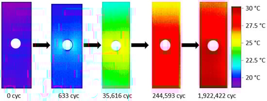 Usually, the loading process can be treated as adiabatic if the fatigue loading frequency is higher than 5 Hz. Therefore, the temperature variation during a cyclic load is related to the stress change. The development of the stresses during the fatigue loading can be considered as an indicator of damage growth [67].