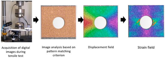The Digital Image Correlation technique (DIC) was used to obtain the strain field on the up layer of the laminate during quasi-static tests. This non-destructive methodology is an optical displacement measure technique that employs image pattern tracking for accurate 2D or 3D surface deformation measurements during testing. In this work, 2D tracking was used. The DIC technique divides the region of interest (ROI) in squared faces to track their displacement based on an image pattern matching criterion and compares each deformed image with either the reference or the previous one. A ROI that covered the whole area around the hole of the specimen was defined. A scheme of the DIC technique application process is shown in Figure 4. As can be seen, the DIC technique enables the detection of strain concentration zones in the analyzed structures, and it is also possible to identify the regions where cracking is initiated.