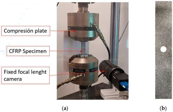 Images were taken with a high resolution fixed focal lens (HF7518V-2, Myutron, Tokyo, Japan) and extension rings of 10 mm (focal length of 65 mm). In order to apply DIC, the upper layer surface of the specimen was speckled using randomly distributed black and white spray paints to increase contrast, as shown in Figure 5b. Moreover, the quality of the pattern was inspected using VIC-2D Digital Image Correlation software (v.6.0.2 Correlated Solutions Inc., Irmo, SC, USA) to verify optimum speckle pattern on the surface of the specimens. A perpendicular relative position between camera and specimen was ensured to acquire images and to avoid out-of-plane displacements during testing, as shown in Figure 5a. All tests were performed under displacement control mode with quasi-static conditions, and an applied displacement rate of 2 mm/min following the D5766/D5766M standard [68]. The force-displacement response data were registered. No pre-load was applied, and all tests were continued until the global failure of the specimens.