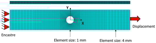 Finite element models of each configuration were developed using ABAQUS/Standard code, aimed at simulating the quasi-static tests described previously. Each model reproduces the multidirectional carbon fiber component described earlier. The laminate is implemented with 3D solid elements C3D8R (8 node-linear brick, reduced integration and hourglass control), with a size of 1 mm close to the hole zone and 4 mm far from this area. One element per ply is defined through the thickness. The symmetry plane in the stacking sequence is considered, hence only half of the laminate is defined (27 plies) to save computational time. The displacement of the workpiece is restricted at one side and a fixed velocity of 2 mm/min is applied to the opposite side simulating the same experimental conditions. All the layers are tied. The scheme of the full model, including boundary conditions, is presented in Figure 6.