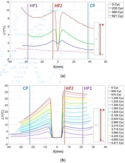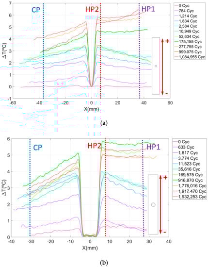 The results of the thermographic analysis in CFRP specimens with-open hole are now presented. Figure 8 presents a plot of the evolution of the temperature increment in the longitudinal middle section of the specimen cut in the direction of the fibers at 0° as a function of the number of load cycles. The variation in the temperature in the Y axis is calculated as T(x)—T0 where T(x) is the temperature of the material at x distance from the center of the hole in a vertical direction and T0 is the initial temperature of the specimen. This expression defines the temperature origin at the hole and is used as an indicator of damage progression.