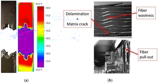 After analysis of the results, it is observed that waviness produces an area of higher temperature where failure occurs. The combination of the local undulation with the stress raiser due to the hole leads to a more critical condition than at the opposite side. For the case shown in Figure 9a, the load was around 85% of the static strength, causing the breakage close to the area with manufacturing defect, as mentioned. For the geometry B, the load was around 70% of the static strength, causing a delamination less severe in the fiber waviness area as shown in Figure 10b. In this case, the fracture was located through the hole (see Figure 10a). The difference between the two specimens was also observed in Figure 8. In these plots, the maximum temperature is reached in the area where final catastrophic failure was located.