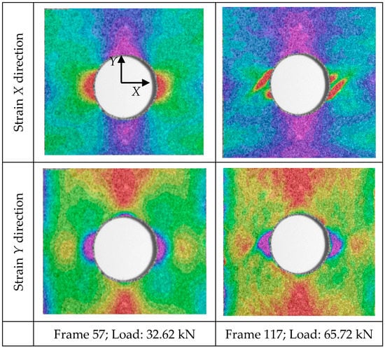Results from the quasi-static tensile test, analyzed through the application of Digital Image Correlation, are discussed in this section. Figure 12 presents the engineering strain distribution in X and Y directions for different load steps of the test for a specimen of geometry B. The DIC technique clearly detects the strain distribution due to the stress raiser during testing. Moreover, it predicts the highly strained areas where fracture is prone to develop; see for example the inclined highly strained distribution surrounding the hole in Figure 12 (top right).