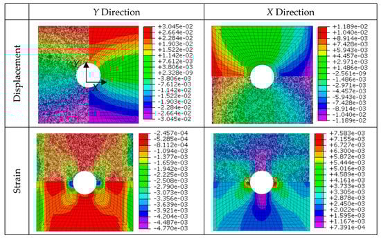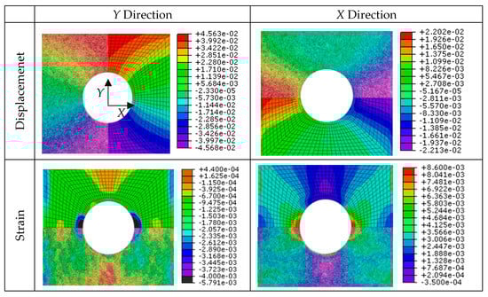 On the other hand, two finite element models that reproduce the static tensile testing were developed. They were validated against the experimental predictions of DIC technique. Specifically, both the displacement and strain fields have been compared for geometry A (Figure 13) and geometry B (Figure 14) configurations. It can be observed that the distribution of the field is very similar for both cases and in both directions, which validates the numerical models developed and points out the effectiveness of DIC technique for surface displacement analysis.