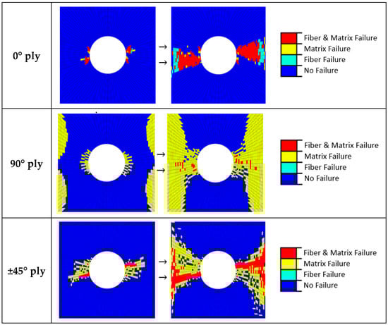 For the plies not oriented in the load direction, the majority of the damage comprises the matrix cracking of the 90° plies. In this case, fibers do not undergo traction conditions and the matrix around the hole and the free edges suffer isolated damage (see Figure 15; middle). There is also some matrix cracking in the ±45° directions and some fiber failure. These plies initiate the matrix cracking. As the load is further increased, the damage grows across the width of the specimen from the hole in a ‘‘zone of influence”, bounded by ±45° (see Figure 15; bottom). Finally, a catastrophic failure happens. The sequence of damage events are similar to previous static models [52].