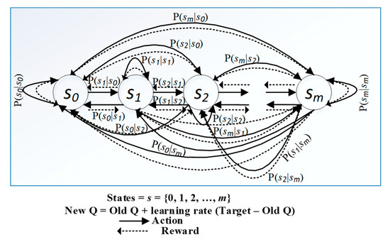 In this study, we utilized a QL technique. The agent was a sensor node, and the environment was the wireless medium. The sensor node learns the environment based on the value function. The function evaluates how good the action is in a given state. The system must satisfy the Markov property called the Markov decision process (MDP) to apply the RL to provide learning and intelligence [46]. The MDP is a mathematical framework for modeling decision making in a specific environment as illustrated in Figure 1. Figure 1 represents the state-transition diagram of the MDP of our proposed system. This figure depicts that a node transmits its state by selecting a forwarding node and updates its routing entries as well as rank information in a practical case study, such as a smart city or smart grid, where a system includes hundreds of connected sensor nodes. In such a system, a transmitting node is always searching for an efficient forwarding neighbor node. The probability that the agent moves into its new state is known as state-transition probability is the probability of the agent making action at state and moving to the new state . Moving from one state to another requires an action space such as,