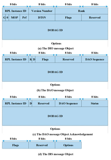 The RPL uses a ranking mechanism as a conventional route selection method. In the RPL, the route construction involves an exchange of control messages, namely, destination oriented directed acyclic graph (DODAG) information objects (DIO), destination advertisement objects (DAO), destination advertisement object acknowledgments, and DODAG information solicitations (DIS) [9]. These messages are very crucial for optimizing network performance. The format of these control messages is shown in Figure 2. The transmission of control message DIO is based on a timer selected by an algorithm called the trickle timer algorithm [44,45]. The DIO transmission rate increases exponentially if the network is inconsistent but decreases to its initial rate if the network is consistent. For a system with a heavy traffic load, the DIO messages result in more congestion and poor network performance. They also cause unnecessary network delays. The two objective functions (i.e., OF0 and MRHOF) for routing decisions in the RPL perform poorly. The OF0 selects the forwarding path based on a simple hop-count irrespective of the path condition, whereas the MRHOF assesses the link quality using a probing method and introduces overheads.