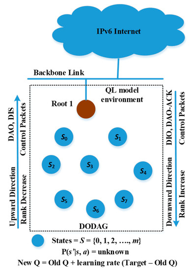 Similarly, the QU-RPL was based on hop-counts, ETX, and queue utilization for path selection. The SL-RPL also utilized ETX for routing metrics. The iCPLA used the collision probability information from the MAC layer to assess the network’s condition, and the nodes learned the collision information using the QL technique. Thus, it eliminated the need for a computationally expensive ETX mechanism.