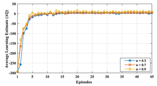 We evaluated the results with varying learning rate α and discount factor . Similarly, was varied to learn the network dynamics with different exploration and exploitation values. We varied and from small to large values (i.e., 0.3, 0.7, and 0.9) with a probability of up to 0.7. If the learning rate α was high, the learning estimated fluctuated, because, in each episode, the node gave more consideration to the new value irrespective of its previous experience. The convergence of the learning estimate is depicted in Figure 4 for various learning rates. The value of α indicates the extent to which the new value overrides the previous value, and it ranged between 0 to 1. If the value of α is closer to zero, the device slowly learns a new value, whereas if the value of α is closer to 1, the device only considers a new value and learns faster. Thus, as shown in the Figure 4, for a higher learning rate α, the learning estimate fluctuated more often, because, in each episode, the node gave more consideration to the new value irrespective of its previous experience. Figure 5 shows the convergence of the learning estimate for various discount factors, i.e., = (0.3, 0.7, and 0.9). The value affects how much weight it gives to future rewards in the value function. A discount factor close to 0 results in state–action values representing the immediate reward, while a higher discount factor (i.e., closer to 1) results in the cumulative discounted future reward. The discount factor profoundly influences the convergence of learning estimates. Thus, the value of is determined based on the convergence of the learning estimate. If a device values the long-term future reward more (i.e., high discount factor ), the learning estimates are closer to the optimal value. If the device gives more value to the current reward, the learning estimate highly diverges from the optimal value initially. The value of is obtained using (3). Therefore, a small value of and substantial value of makes converge faster with less fluctuation. According to Reference [54], Q-learning will converge if the learning rate goes to zero or small state–action space will also converge if the learning rate is low and fixed. In our proposed mechanism, the nodes visit each state–action pair a number of times and updates the process. During the time duration of the network, all state–action pairs are performed.