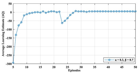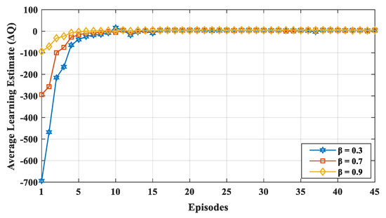 The convergence of indicated that the nodes in the network learned the environment. The nodes exploited the learned information to make better decisions. The value was not uniform at the start owing to the exploration of the environment which also means that the value function was not optimized at this stage. With each episode, the nodes tended to move toward the positive reward state. In the early stages of learning, the Q-function was not adequately trained. We can observe that after ten episodes, the network started to become stable which led to the optimization of the performance. Each episode had a 10 s duration of transmission interval. The convergence of indicates that there existed an optimal solution for the environment, and the network converged to a stable equilibrium. We also evaluated the learning estimate in a dynamic network environment by adding 20 more nodes to the network during the simulation. Figure 6 displays the effect of a dynamic network environment on which shows that after 23 episodes, when new nodes were added in the network, the proposed mechanism performed learning activities to relearn the network dynamics. Therefore, the value of learning estimate () fluctuated when the episode was 23 (Figure 6). Later, the network again converged and, thus, optimized the network’s performance in a dynamic setting.
