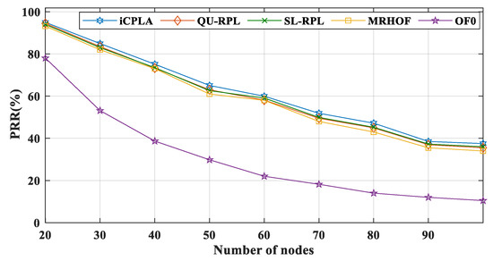 The packet reception ratio (PRR) is the total number of packets successfully received by the sink node divided by the total number of transmitted packets. To evaluate the performance of the iCPLA, we compared its simulation results with those of the de facto MRHOF, OF0, and recently proposed SL-RPL along with QU-RPL. Figure 7 shows that the iCPLA optimized the PRR. Its performance was better than those of the other protocols, indicating that the learning-based protocol was useful for learning the wireless network. The SL-RPL, QU-RPL, and MRHOF also developed a more reliable system compared to the OF0. The OF0 did not contain any link reliability protocol and utilized only the hop-count information. The MRHOF used the ETX-based link assessment method.