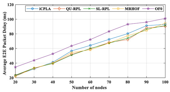 The average end-to-end packet delivery delay (E2E) shows the average delay of all packets in the network. The E2E delay is the time taken by a packet to reach its destination node from its source. Figure 8 illustrates the performance of the iCPLA protocol along with the standard MRHOF, OF0, SL-RPL, and QU-RPL mechanisms in terms of the average E2E packet delay (in milliseconds). The OF0 incurred the highest E2E delay. The OF0 used a forwarding path based on hop-counts irrespective of the congestion status of the links. The MRHOF, QU-RPL, and SL-RPL had almost similar delay patterns, because both they used a continuous probing method. The proposed iCPLA mechanism had a higher E2E delay compared to MRHOF and QU-RPL; however, it did not exceed that of OF0. The higher delay was due to the learning process of the intelligent nodes.