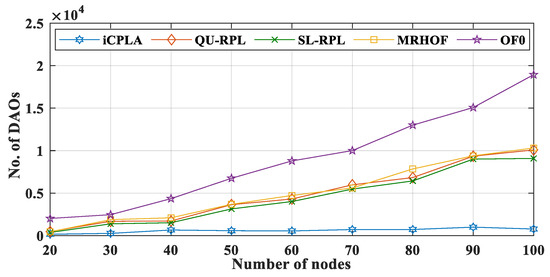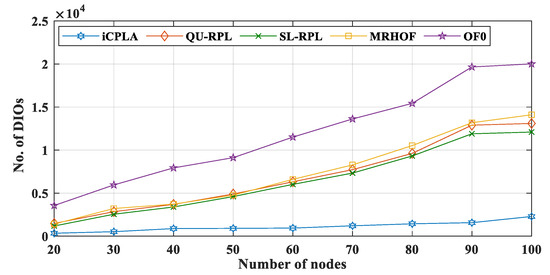 The IoT devices contain minimal energy, memory, and computational capabilities. The nodes transmit control packets along with data transmission. These control packets significantly reduce the energy, memory, and computational capacity of the devices. Thus, it is imperative to reduce the transmission of control messages without compromising network performance. The RPL incurs three control overheads, i.e., DIO, DAO, and DIS (explained in Section 3.2.2). The nodes maintain the network connectivity using these control packets, and these control packets are regulated by a mechanism called trickle timer. If the network is stable, fewer overheads are exchanged and vice versa. Based on the network conditions, DIO messages are exchanged, and a trickle timer algorithm controls their transmission frequency. Figure 9 and Figure 10 present the total number of DIO and DAO control packets transmitted in the network, respectively. The proposed iCPLA method significantly reduced the control packet transmissions compared to QU-RPL, SL-RPL, MRHOF, and OF0. After learning, the estimate become stable, and the nodes estimated the collision probability intelligently. The nodes in the iCPLA evaluated, learned, and observed their actions based on learning to achieve optimal performance. The network with poor PRR incurred the highest DIO transmission. As an increasing number of packets were dropped, the network became more unstable which led to more DIO transmissions. Therefore, the OF0 incurred the highest DIO overhead in the network. The QU-RPL, SL-RPL, and MRHOF both used the ETX probing method which required more control packets. The QU-RPL incurred slightly fewer overheads compared to the MRHOF due to the utilization of queue information which helped in balancing the load. Similarly, SL-RPL further balances the load by considering the packet transmission rate in its routing metric.