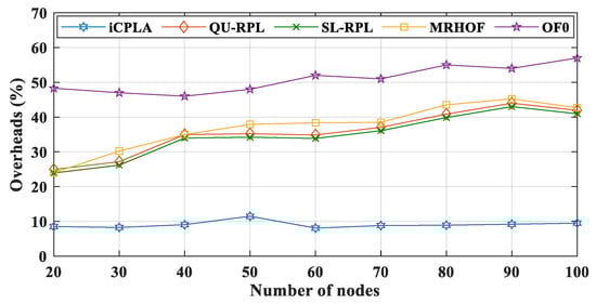 The destination information of the transmitting nodes was transmitted to the sink node via the DAO control packet. Generally, DAO packets are generated and contribute significantly to the control overhead. The DAO is sent to the sink node when the upward path is changed. With the transmission of DIO and DAO packets, the scarce energy of the nodes is wasted. The proposed iCPLA protocol also reduced the number of DAO control packets significantly, compared to the QU-RPL, SL-RPL, MRHOF, and OF0. When the network was initialized, all packets were control messages. The nodes started the transmission of data packets after the network construction was completed. A comparison of the transfer of the total percentage of control overhead versus the data packet transmission is shown in Figure 11. The proposed iCPLA protocol had the lowest overall percentage of overhead. More transmission of the control overhead means more energy is wasted in its transmission rather than data packet transmissions. The OF0 had the highest percentage of control overhead, because it was unable to resolve the congestion and load-balancing problem. The iCPLA maintained almost the same overhead percentage whether with a small or a large number of nodes. Its total overhead was only approximately 8–9%. The self-learning capability using the RL-based technique gave nodes the ability to make intelligent decisions in an unknown environment. The overhead percentage graphs demonstrate that the iCPLA created a consistent, stable, and less congested network which also affected the network’s energy consumption.