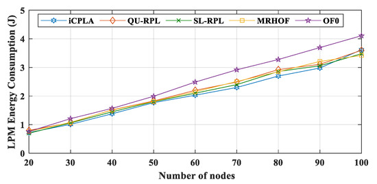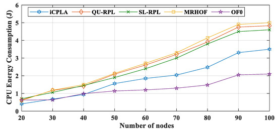 Energy is the most important resource in a sensor network. The IoT nodes consume most of the energy during communication. The nodes spend a significant amount of energy during the transmission and reception of packets. The nodes turn their radios off when they are not transmitting or receiving any packet. The state when the radio is off, and the microcontroller is idle is called low-power mode (LPM). For the Z1 mote, the current consumption during LPM is 20 µA. Similarly, the state when the radio is off, and the microcontroller is on is referred to as CPU idle state (CPUI). The Z1 mote consumes 42.6 µA during the CPUI state. The highest amount of current is consumed during the transmission and reception periods. The transmission current (Tx) consumption is 17.4 mA, whereas the reception current (Rx) consumption is 18.8 mA. These current consumptions come from the Z1 mote specifications [52]. During the simulation, the RTIMER_SECOND value was used to convert the ticks into seconds. The ticks per second value of the Z1 mote was 32,786. During the current consumption of all four stages, a voltage of 3 V was utilized. We measured the energy consumption of the proposed iCPLA protocol and compared it to those of the QU-RPL, SL-RPL, MRHOF, and OF0 during all four stages of communication, i.e., LPM, CPU, Tx, and Rx. The energy consumption (in joules) in each state was measured as follows:
