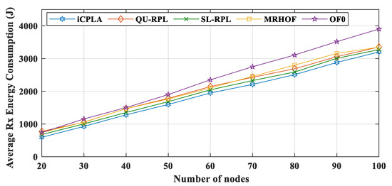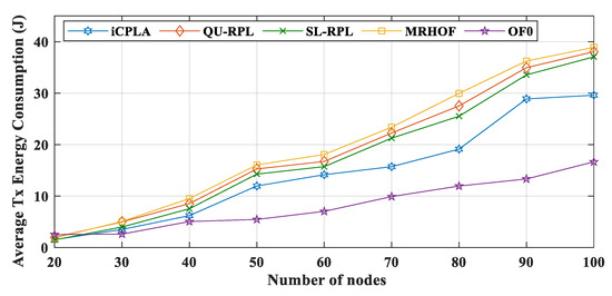 The energy consumptions during Tx are displayed in Figure 14. The OF0 had the highest total amount of overhead, but it shows a lower Tx value due to the fact of its poor packet delivery ratio. The size of the data packets was more significant than that of the control overhead; thus, it required more energy for transmission. Because most of the packets were dropped in the OF0, the nodes consumed less energy in transmitting the data packets. The proposed iCPLA maintained a Tx lower than those of the QU-RPL, SL-RPL, and MRHOF. The iCPLA had the lowest control overhead, and therefore the overall Tx was lower compared to those of the QU-RPL, SL-RPL, and MRHOF. The overhead of iCPLA was approximately 8–9% more economical as compared to 20–42% of the QU-RPL, SL-RPL, and MRHOF. Also, it was 48–58% in the OF0, as presented in Figure 11. Similarly, Rx energy consumption is shown in Figure 15.