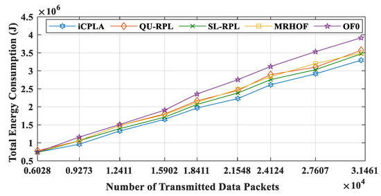 From the results, we can conclude that the OF0 consumed most of the energy for transmitting control packets. In contrast, most of the energy in the iCPLA was consumed during data packet transmission. Even with a higher PRR, the iCPLA energy consumption was lower due to the significantly lower control overhead. The node spends the highest amount of energy during packet reception. Each node receives packets from multiple nodes and acts as a relay node. The total energy consumption versus the number of transmitted data packets in the network is illustrated in Figure 16. The proposed protocol maintained the lowest total energy consumption compared to the other state-of-the-art mechanisms. Energy reduction is one of the most important design goals in IoT network communication because sensor nodes are required to operate for months or years in a remote location.