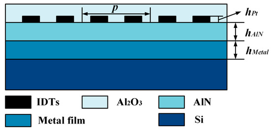 In this contribution, the excitation and propagation characteristics of SAW in the multilayer composite structure of Al2O3/IDTs/AlN/metal thin–plate/Si were investigated theoretically by the finite element (FEM) analysis. Figure 1 depicts the cross-section schematic of the SAW device built by composted AlN structure, where p, hAlN, hPt, and hMetal denote the period of IDTs, AlN thickness, Pt electrode thickness, and Pt thin–plate thickness, respectively.