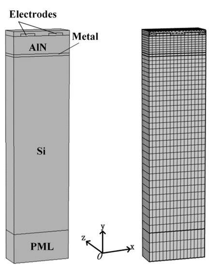 Figure 2 shows the three-dimensional (3D) periodic model of the proposed SAW device. The hypothesis of continuous periodicity was set to improve the computation efficiency in the computation. It is well-known that the acoustic energy is confined in the piezoelectric crystal surface within several wavelength depths. Hence, the perfect matching layer (PML) can be used to reduce the thickness of the Si substrate, which can save the calculation time and effectively suppress the spurious waves from the interface reflection [14]. The corresponding material constants are revealed in the series literature [18,19,20,21].
