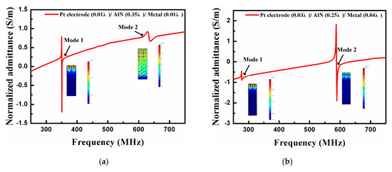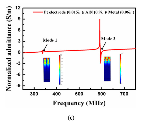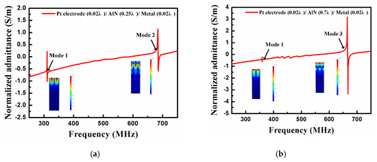 Figure 3 indicates the relationship between frequency f and input admittance Y in the infinite IDT. As shown in Figure 3a, when the hAlN is 0.25 λ (λ is the acoustic wavelength), two distinct SAW modes can be observed in the calculation. In this example, mode 1 represents the Rayleigh wave mode, and the resonance frequency is about 310 MHz. Meanwhile, mode 2 is an A-type Lamb wave mode [19,22,23,24], with the resonance peak position at about 690 MHz. Additionally, a new acoustic mode emerges at a fixed hAlN of 0.7 λ, as shown in Figure 3b. Here, mode 3 is the S-type Lamb wave mode [19,22,23,24], and it dominates at ~670 MHz.
