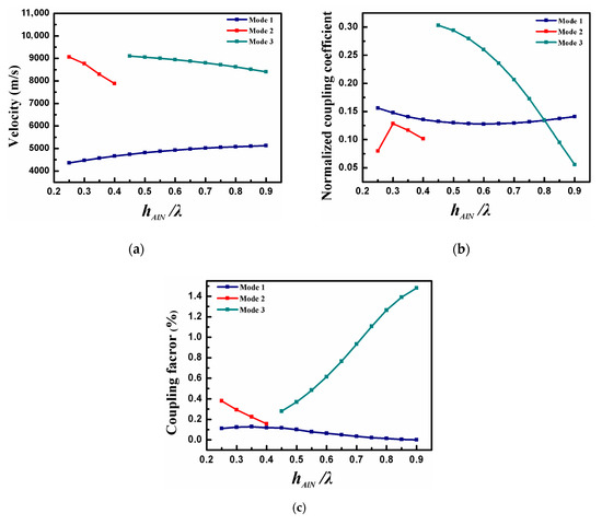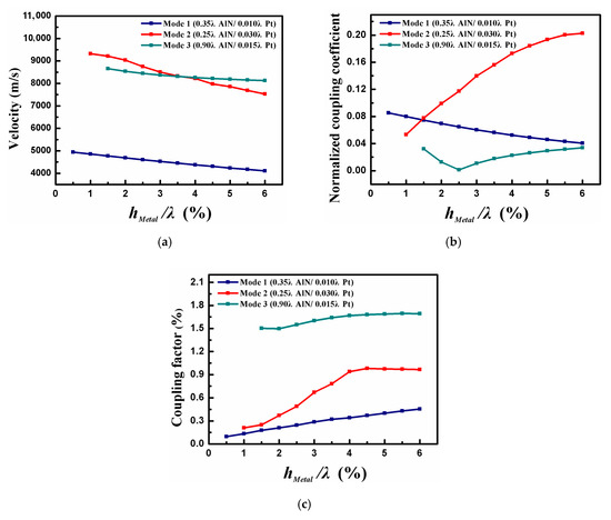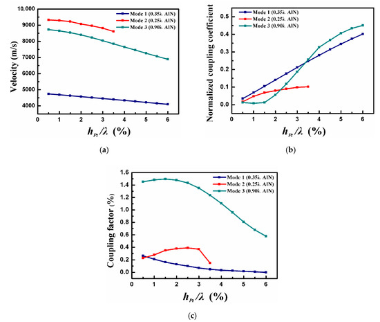 The Pt electrode thickness and the metal thin-plate thickness were both set to 0.02 λ. Figure 4 depicts the COM parameters as the function of normalized AlN thickness (hAlN/λ). It is seen that mode one and mode 2 are the main acoustic wave modes at a thin-AlN film. However, as the AlN thickness increases, mode one and mode 2 are gradually suppressed while mode three is generated. When the hAlN/λ is over 0.45, mode one and mode 3 become the main propagation modes, and mode 2 has almost disappeared.