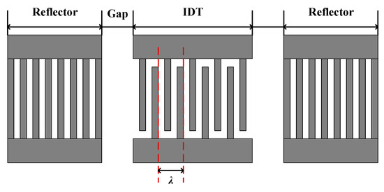 SAW sensors generally adopt a delay line structure or a resonator structure. Compared with the delay line, the SAW resonator has high Q-value and low insertion loss [26]. Therefore, it is widely used in wireless and passive SAW sensors, especially for sensing at high temperatures. Here, the synchronous one-port SAW resonator (Figure 8) will be used for the next simulation analysis.