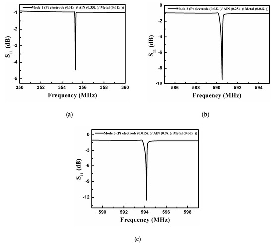 The frequency response (S11) of the synchronous one-port SAW resonator when the operating mode is (a) mode 1, (b) mode 2, and (c) mode 3.