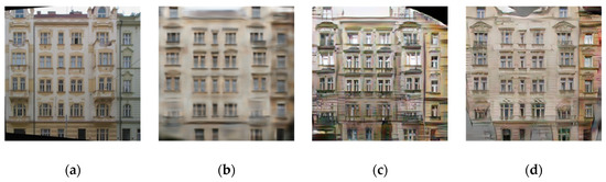 We train models to separate the effect of different variations of loss functions on the architectural CMP facades “label to photos” dataset. We perform tests to compare the impact of each part of Equation (10). Figure 4 shows the qualitative results of the variations mentioned below on labels to photos problem.