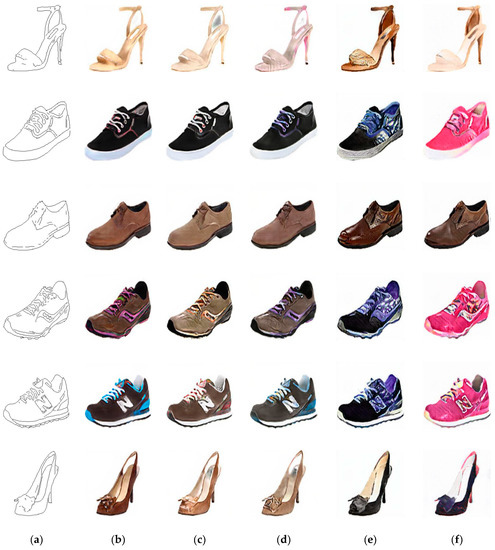 Samples result from edges to shoes. (a) input images, (b) results of the IP-RAN, (c) results of the pix2pix-cGAN, (d) results of PAN, (e) results of UTN-GAN, and (f) results of iPANs