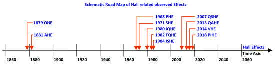 Schematic time line of the main Hall related observed Effects. OHE—Original Hall Effect; AHE—Anomalous Hall Effect; SHE—Spin Hall Effect; IQHE—Integer Quantum Hall Effect; FQHE—Fractional Quantum Hall Effect; ISHE—Inverse Spin Hall Effect; QSHE—Quantum Spin Hall Effect; QAHE—Quantum Anomalous Hall Effect; PHE—Planar Hall Effect; VHE—Valley Hall Effect; PIHE—Photo-Induced Hall Effect.