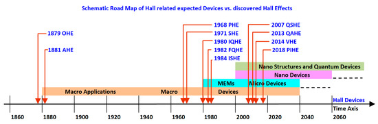 Looking into previous publications, one can understand how useful the Hall Effect can be whenever applied into specific applications. In these text books, there are extensive lists of specialized devices. Let us look at two examples: In the sixties, W. E. Bulman presented a set of classic applications and devices, in a large study [34], and per different configurations. He divided the areas of applications to three parts: Magnetic fields measurement, magnetic fields control, and microwave power sensing. In case of combined Hall Effect probes and additional electromagnets, a series of macro devices could be obtained. Among others, one can find isolators, gyrators, transducers, circulators, phase detectors, but also magnetometers and magnetic tape read-out heads. A few decades later, in the 1990s, and still fitting the macroscale dimensions, Honeywell Corporate presented specialized devices applied to the sensing of parameters and applications [31]. Among others, and as a key player in the sensing activities, they presented Hall Effect-based sensors for the measurement of physical parameters such as flow rate, current, temperature, pressure, speed, angle, rounds per minute (RPM), position, etc. They proposed devices for diverse applications related to the civil life such as office machine sensor, magnetic card reader sensors, door interlock, and ignition sensors. Other devices were more oriented to the industry itself, such as automotive sensor, brushless DC motor sensor, piston detection sensor, transmission mounted speed sensors, etc. Dealing for years with the development of nanoscale devices, these two examples reinforced me in understanding how today, in the nanotechnology era, it became desirable to design nanoscale devices with an integrated Hall Effect, as presented all along this up-to-date review. Figure 2 presents a schematic flow of parallel progress, with the development of devices in macro-, micro- and nanoscale ranges depicted on a time axis of Hall Effects discoveries.