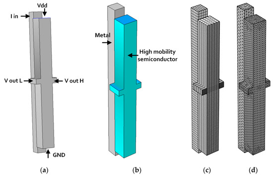 In order to perform a complete and accurate numerical study of such devices, design, and simulations, the platform of Comsol Multi-Physics Software Package [67] is usually used. This platform’s approach is based on the Finite Elements Method (FEM) [68,69], and it shares several modules. Several types of micro- and nanoscale devices have been designed with this platform [70,71]. In the specific case of Hall Amplifier [71], the required simulation models are the AC/DC module, the semiconductors module, and the Heat Transfer module. Even for a simple design such as the Hall Bar (HB) shown in Figure 4, it is necessary to follow a well-built flow of steps such as geometry shapes design, ports and layers definitions, and automatic or manual mesh definition to improve the simulation resolution. Comsol enables several shapes of mesh elements, and an expert designer will know how to optimize the usage of the mesh for better density and accuracy in sensitive parts of the designed structure. Mesh accuracy is very important, since it enables improving the accuracy on the short circuit effect and other secondary effects such as planar Hall Effect, etc. For example, while Figure 4c presents the default automatic mesh structure, made of cubes, Figure 4d presents the same design while manually optimized with triangular smaller elements. Of course, there is a trade-off in such an optimization: Accuracy will always require longer run times since the whole volume is divided in much more elements. This is why it is usually recommended to check first runs with coarse FEM and then to gradually enhance the critical zones’ accuracy. Only then functionality simulations and additional checks can be performed. Sometimes, in order to simulate complex analyses, it is necessary to combine the usage of several additional modules.