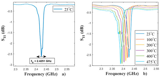 The narrow-band frequency response of , ranging from 2.25 GHz to 2.6 GHz, was measured as shown in Figure 2a The center frequency of the first mode measured at room temperature (RT) and is equal to 2.4251 GHz. The frequency responses of SAW devices, reflection () mode, were measured in the temperature range 23–500 °C and are shown in Figure 2b We note a slight decrease in the Pt/AlN/Sapphire resonator amplitude peak and a decrease in frequency with increasing temperature.