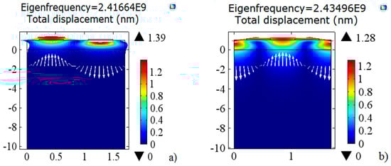Figure 3 shows the mappings of the first two modes of symmetrical (Figure 3a) and antisymmetric (Figure 3b) Rayleigh waves in the Pt/AlN/Sapphire structure, simulated at 23 °C. The Eigen frequency of the symmetrical mode noted that is equal to 2.41664 GHz and the corresponding amplitude of displacement is 1.36449 nm. The Eigen frequency of the asymmetric mode noted that is equal to 2.43496 GHz and the corresponding amplitude of displacement is 1.27282 nm.