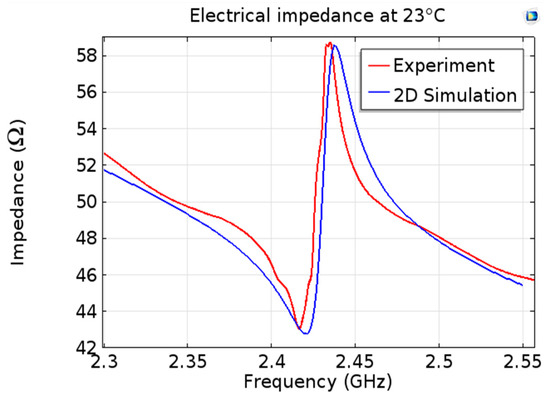 We can access in COMSOL the modeled values of the electric potential as a function of the frequency and consequently obtain modeled module of impedance as a function of temperature. Figure 4 shows simulated (blue) and experimental (red) impedance as a function of the frequency at 23 °C. We can see a good agreement between the two curves. The simulated values of frequencies and are, respectively, 2.4166 GHz and 2.4349 GHZ.