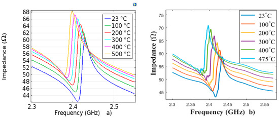 The impedance variations as a function of temperature for simulated and measured devices are shown in Figure 5, in the temperature range [23 °C, 500 °C].