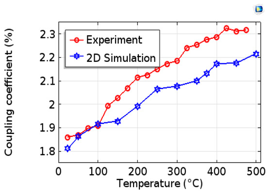 At room temperature (23 °C), the value of the electromechanical coupling coefficient of our modeled device is 1.812% and the measured value is 1.868%. Figure 7 presents a comparison of the variation in electromechanical coupling as a function of the temperature obtained from the experimental measurements and the simulations of the Pt/AlN/Sapphire sensor [18]. Figure 7 shows that the k2 coefficient increases with temperature. For measured and modeled k2, enhancements of 27% and 22%, respectively, are recorded when the temperature increase from 23 to 500 °C. This demonstrates that the piezoelectrical properties of the AlN/Sapphire structure are enhanced by temperatures up to at least 500 °C. Note that when the device is cooled down, k2 returns to its original value. We observe a good agreement of the two dispersion curves of k2. We note, however, that k2 resulting from the simulation increases more slowly with temperature than that obtained experimentally.