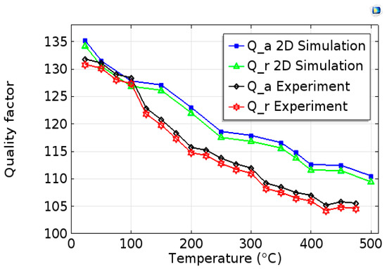 At room temperature, we obtain the following values: for measurements and , for simulations and . One can also observe that the quality factors modelled and measured decrease (by about 23%) when temperature increases. Note that the quality factor is inversely proportional to the ratio of the dissipated energy to the stored energy, which is represented by the loss factor (tan δ) in dynamic mechanical analysis (DMA).