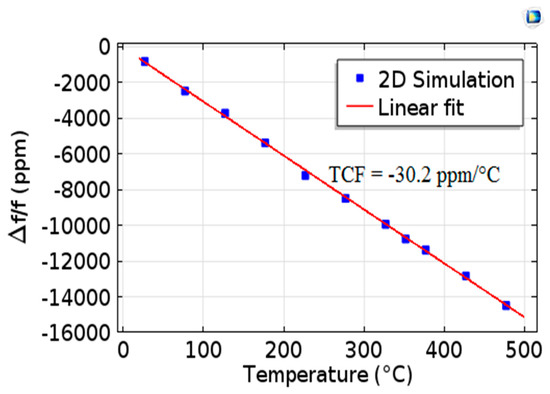 To evaluate the potential of the structure as a temperature sensor, the frequency-versus-temperature behavior of the Pt/AlN/Sapphire SAW resonator was investigated. For the 2D simulation, the relative variation in the resonant frequency as a function of temperature is presented in Figure 9. We determined the TCF from the following Equation (20):
