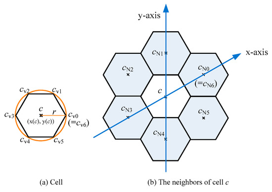 A cell c is a regular hexagon area, defined as (c, r), where (x(c), y(c)) is the geographical coordinate, and r is the length of the regular hexagonal side. Moreover, V(c) = {cV0, cV1, cV2, cV3, cV4, cV5} is defined as the set of six vertices and NB(c) = {cN0, cN1, cN2, cN3, cN4, cN5} is defined as the set of six neighboring cells. Table 1 provides the coordinates of each vertex in V(c) and Table 2 provides the coordinates of each neighbor in NB(c).