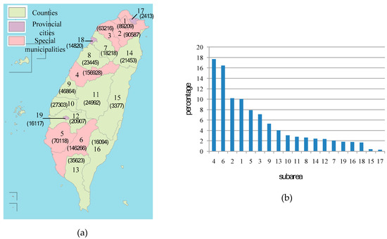 The experimental area with 887,950 points. This area currently contains 6 special municipalities, 10 counties and 3 provincial cities. These subareas are numbered as 1–19: (a) The number of points in each subarea. (b) The point ratio of each subarea to 16 subareas.