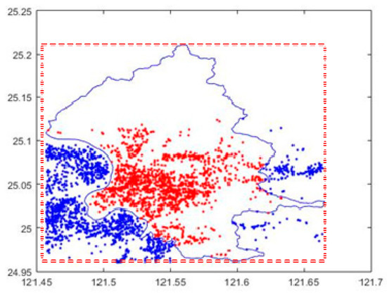 Figure 5 provides the distribution of points for subarea 1 and its neighborhood. The range has 93,549 points, where there are 89,029 points inside subarea 1 and 4520 points not-inside subarea 1. Most of the points are gathered in subarea 1. Moreover, the points are concentrated between longitude 121.45 to 121.6 and latitude 24.95 to 25.01. However, there are almost no geographic points between latitude 25.1 and 25.22. Obviously, the distribution of points is very uneven. Then, we continue to calculate the locations of the hot spots to reveal the concentrations.