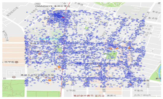 The area is divided into small areas, termed as spots, with a range of 0.01 degrees of latitude and longitude, and the area is slightly larger than 1 square kilometer. As shown in Table 4, there are a total of 15,573 spots. There are 15,347 spots whose numbers of points are less 1000. However, there are 12 spots whose numbers of points are more than 4000. Table 5 provides the details of the 12 hot spots, including the locations, the coordinates, and the numbers of points. The 12 hot spots are in subarea 4, subarea 6, subarea 9, and subarea 19. Moreover, subarea 4 contains six hot spots, subarea 6 contains four hot spots, subarea 9 contains one hot spot, and subarea 19 contains one hot spot. Figure 6 shows the distribution of points in hot spot one. There are 6024 points in this range of about one square kilometer. It means when we are in this hot spot, we are easily exposed to these targets (points). The analysis of hot spots helps to understand whether the target is concentrated in a certain small range, and it is also easy to monitor these spots.
