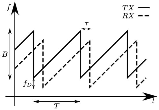 An FMCW signal, also known as linear FMCW (LFMCW) or linear frequency modulated (LFM) signal, consists of a linearly modulated continuous wave radio energy transmitted in a desired direction. These kinds of signals are often referred to as chirps and differ from CW because, in the latter, the operating frequency is not varied during the transmission, as shown in Figure 3a,b. Radars using such waveforms became very popular especially in the automotive field, due to the low cost of hardware components, and thanks to their ability to provide both range and Doppler information. The FMCW transmitted and received signals are schematically depicted in Figure 4; from these signals, it is possible to extract delay and phase information, which are useful to obtain distance and velocity information of one or more targets simultaneously. The basic processing of the received signal is performed through I/Q demodulation (as reported in Figure 5), which provides in-phase and quadrature-phase components of the complex baseband signal, called beat signal or Intermediate Frequency (IF) signal. The down-conversion is introduced to considerably simplify the realization of the processing circuits, allowing the circuit to work at much lower frequency compared to the transmitted signal. The substantial difference between FMCW and CW processing chains, see Figure 5, is only in the control signal generator, which provides the reference signal (in the CW case it is a constant one). Combining this signal with a voltage controlled oscillator (VCO) produces the resulting RF signal that will be transmitted by the radar.
