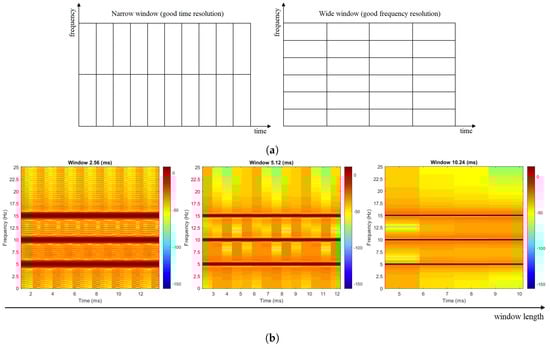 Short Time Fourier Transform (STFT) time–frequency resolution. (a) Narrow vs. Wide window (b) Example of time-frequency resolution for increasing window size.