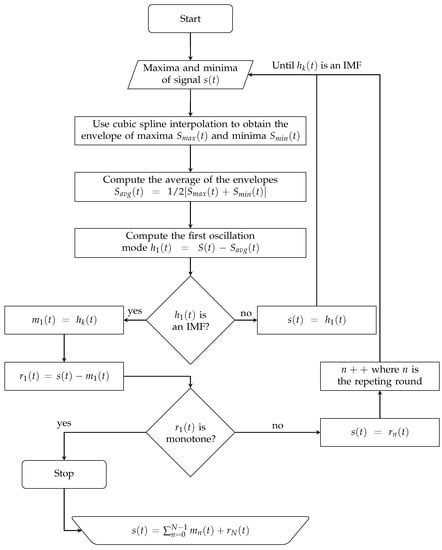 Another interesting feature of the IMFs is the orthogonality between each of them, which represents a useful property for many applications. For instance, it is possible to perform signal filtering by selectively picking or adding some of the IMF together, while omitting the others. Denoting by the initial signal, the EMD algorithm basically consists of applying different shifting operations to that signal. The flowchart of such an approach is reported in Figure 7, more details can be found in [].