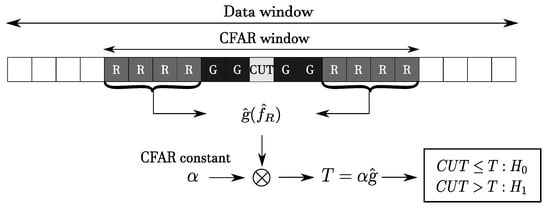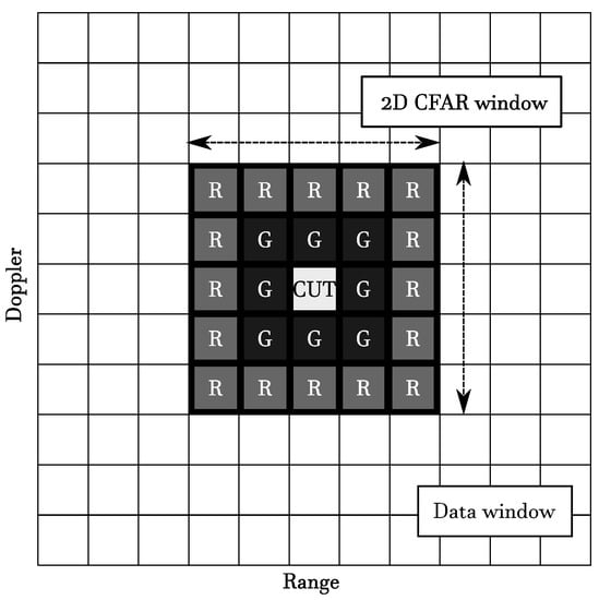 The basic architecture for a CFAR detector is reported in Figure 8. The cells labeled as G are guard cells, and are considered or not according to the type of CFAR approach. Usually, they are introduced when it is expected that cells close to the cell under test (CUT) might be contaminated by returns, hence they are excluded from the estimation of the disturbance to avoid bias. The cells labeled as R are the reference cells used to construct the estimate of the interference statistic. The statistic computed on the CUT is compared to the CFAR threshold to determine the presence or absence of a target. All these quantities constitute the CFAR window, which is moved along the data dimension one cell at a time (and for each shift a detection decision is made regarding the measurement in the CUT). The CFAR window may also be multidimensional; for example, Figure 9 represents a 2D CFAR window.