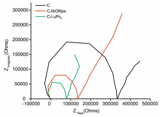 Nyquist plots registered at −0.5 V using (black) C (red) C-NiONPs and (green) C-LuPc2 electrodes immersed in catechol 1 × 10−3 mol·L−1 with 0.1 mol·L−1 KCl as the supporting electrolyte. Frequency swept varied logarithmically from 10−2 Hz to 105 Hz.