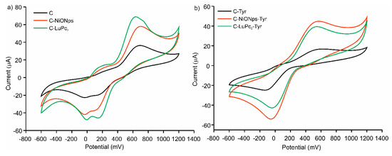 Cyclic voltammograms in catechol 1 × 10−3 mol·L−1 with 0.1 mol·L−1 KCl as the supporting electrolyte. (a) C, C-NiONPs, C-LuPc2, non-enzymatic electrodes (b) C-Tyr, C-NiONPs and C-LuPc2-Tyr enzymatic electrodes.