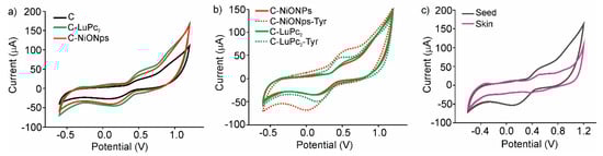 Cyclic voltammograms: (a) C, C-NiONPs, C-LuPc2, non-enzymatic electrodes applied in the analysis of Cabernet seeds extract (b) C-NiONPs, C-NiONPs-Tyr, C-LuPc2, C-LuPc2-Tyr electrodes applied in the analysis of Prieto Picudo seeds extract (c) C-LuPc2 electrode applied in the analysis of Garnacha skins and seeds extracts.